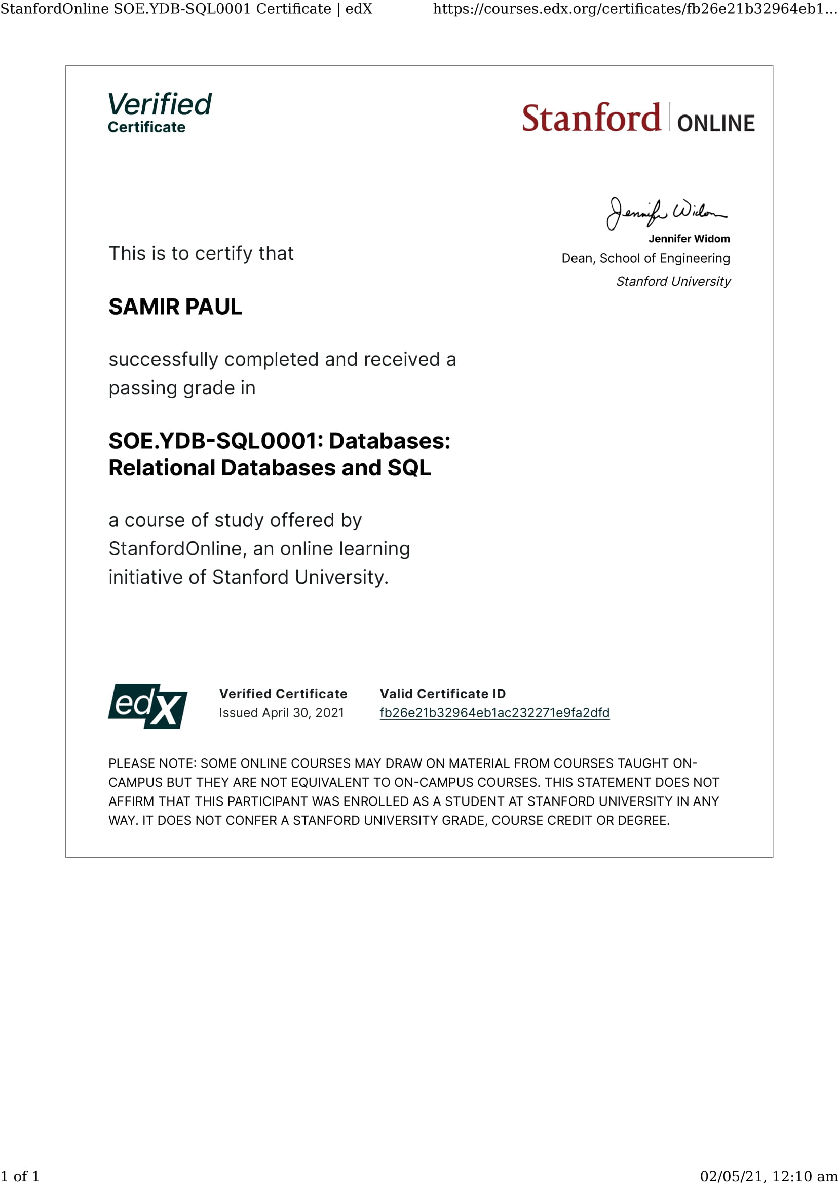 StanfordOnline & edX: Databases: Relational Databases and SQL - SOE-YDATABASES0001